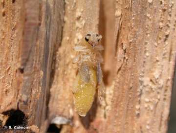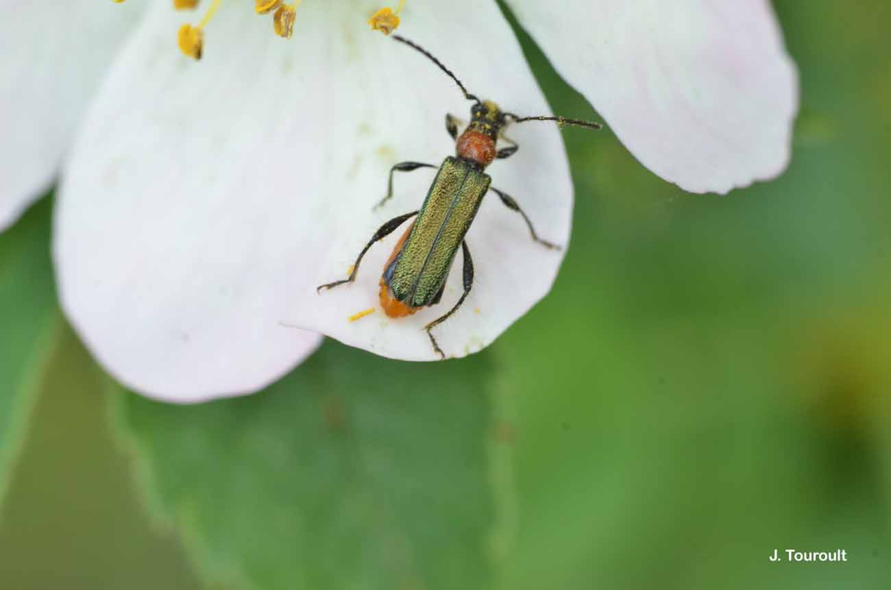 Corps et pattes noires, élytres métalliques. Femelle avec le pronotum rouge.