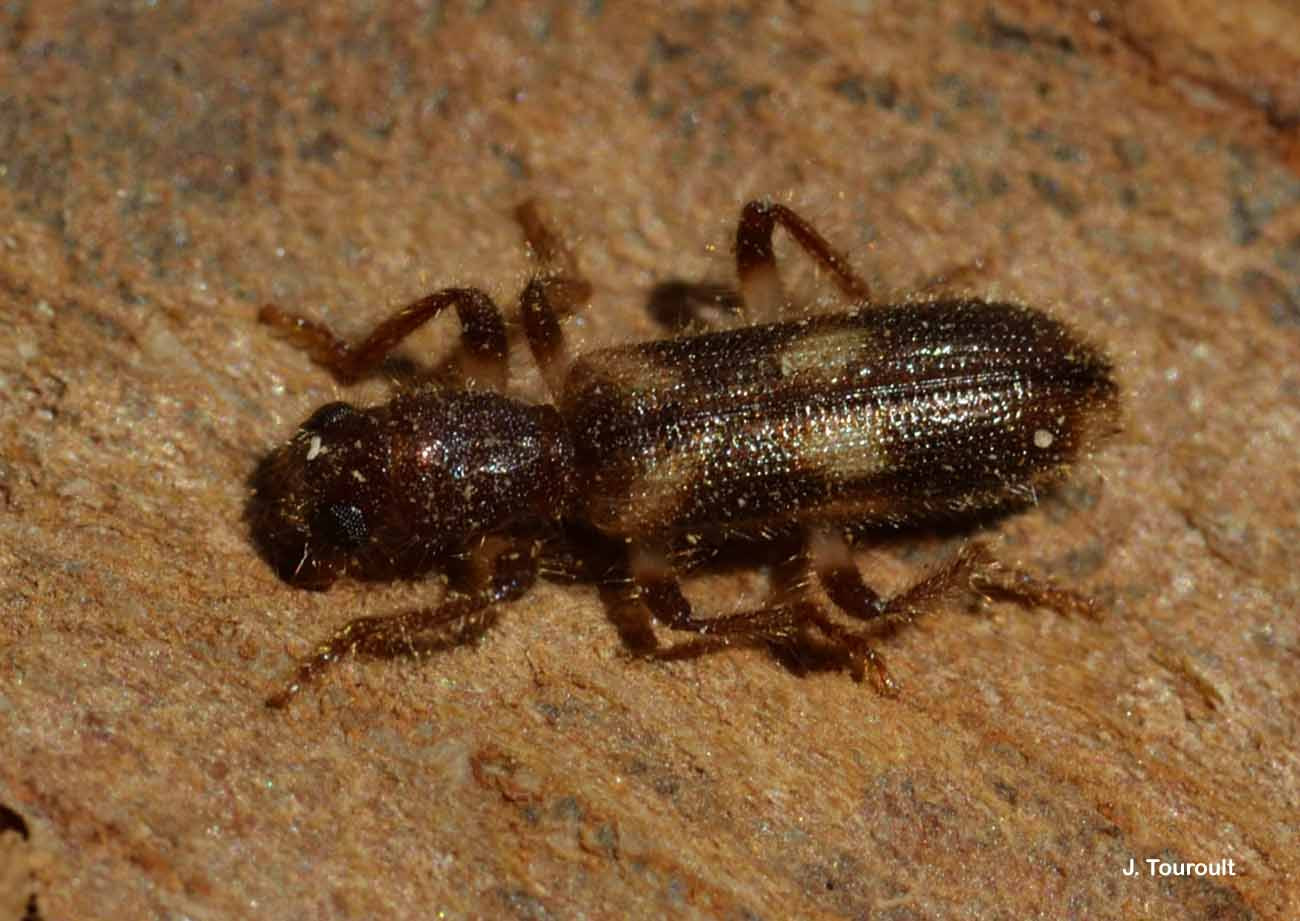 Corps en cylindre large, densément couvert de pubescence, allongé, brun-noir avec les antennes, les pattes et six taches élytrales transversales brun-jaune. Les élytres portent deux taches humérales, deux médianes et deux apicales. Les fémurs sont plus ou moins rembrunis. La pubescence est claire, longue, hérissée. Les élytres sont fortement ponctués, les lignes de points nettes jusqu’à l’apex. Les antennes sont fines, légèrement épaissies vers l’apex. Le pronotum est subcarré, rétréci à la base, fortement et densément ponctué.