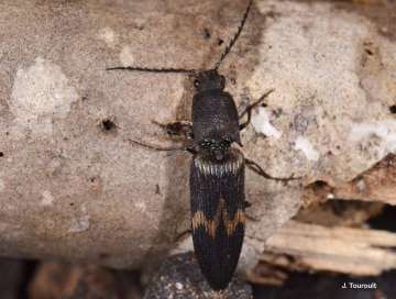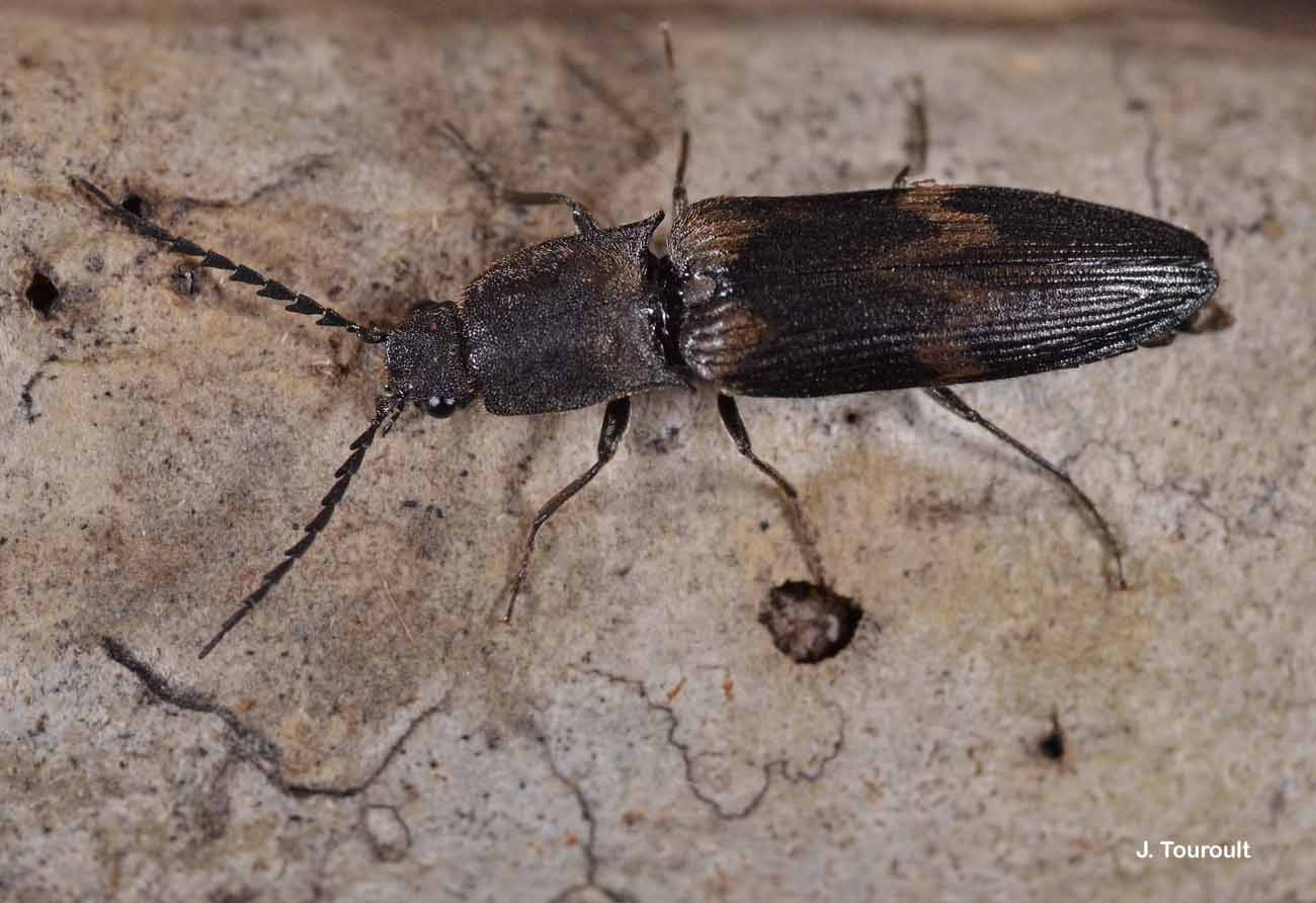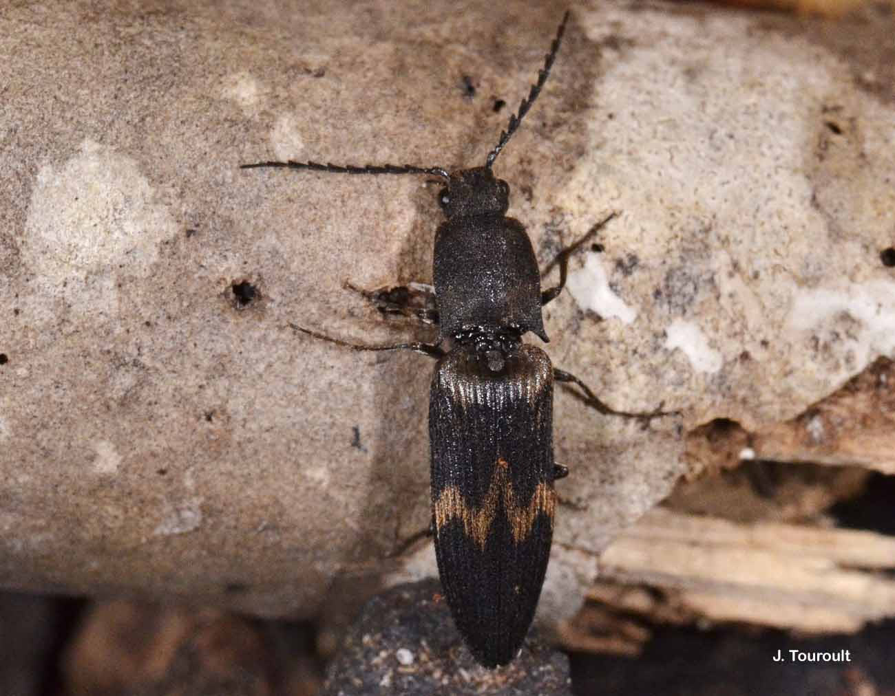 Diagnose : Corps allongé, convexe, avant-corps noirs avec les élytres brun foncé. La pubescence blanche, fine et longue lui donne un aspect grisâtre à l’exception de deux fascies transverses en zigzag sur les élytres où la pubescence est noire. Les antennes courtes et fortement dentées à partir du 3ème article atteignent juste le bord postérieur du pronotum qui est peu convexe, aussi long que large avec les angles postérieurs étirés en longues pointes divergentes. La ponctuation du pronotum est forte, ombiliquée et très dense. Les pattes sont brun foncé. La larve est filiforme et cylindrique (de type "ver fil-de-fer"), noire dorsalement et pâle ventralement, le dernier segment orné de deux dents. Identification : Assez facile. Confusions possibles : Stenagostus rhombeus, de même stature a une fascie en zigzag sur les élytres et est brun-orangé. Périodes d’observation (adultes) : Juin à août. Biologie-éthologie : La larve se développe dans le bois carié des résineux de montagne. Les adultes se rencontrent sur les plantes basses et les troncs coupés. Biogéographie-écologie : Forêts résineuses des montagnes de l’Europe septentrionale et centrale et d’Asie tempérée. Références : Leseigneur L., 1972. Coléoptères Elateridae de la faune de France continentale et de Corse. Bulletin mensuel de la Société Linnéenne de Lyon (supplément au numéro de février 1972) 41 : 1-381.