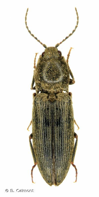 Diagnose : Corps allongé, peu convexe, entièrement noir peu brillant avec une fine pubescence blanche bien visible donnant un aspect grisâtre à l’insecte. Les pattes sont noires avec les ongles nettement dentés à la base. Les antennes noires sont faiblement dentées à partir du 3e article et atteignent à peine le bord postérieur du pronotum chez la femelle, le dépassent d’un article chez le mâle. Celui-ci est convexe, globuleux, aussi large que long, à ponctuation très dense mais très fine. La base du pronotum est nettement bisinuée devant le scutellum. Identification : Très difficile. Confusions possibles : Les Cardiophorus noirs n’ont pas les ongles dentés, les autres taupins noirs n’ont pas le pronotum globuleux. D. equiseti a la base du pronotum à peine sinuée devant le scutellum. Périodes d’observation (adultes) : Avril à juin. Biologie-éthologie : La larve est terricole et vit aux dépens des racines de diverses plantes. Les adultes se rencontrent sur les arbres et arbustes en fleur ou sur les plantes basses. Biogéographie-écologie : Biotopes sableux des plaines de toute l’Europe. Références : Leseigneur L., 1972. Coléoptères Elateridae de la faune de France continentale et de Corse. Bulletin mensuel de la Société Linnéenne de Lyon (supplément au numéro de février 1972) 41 : 1-381.
