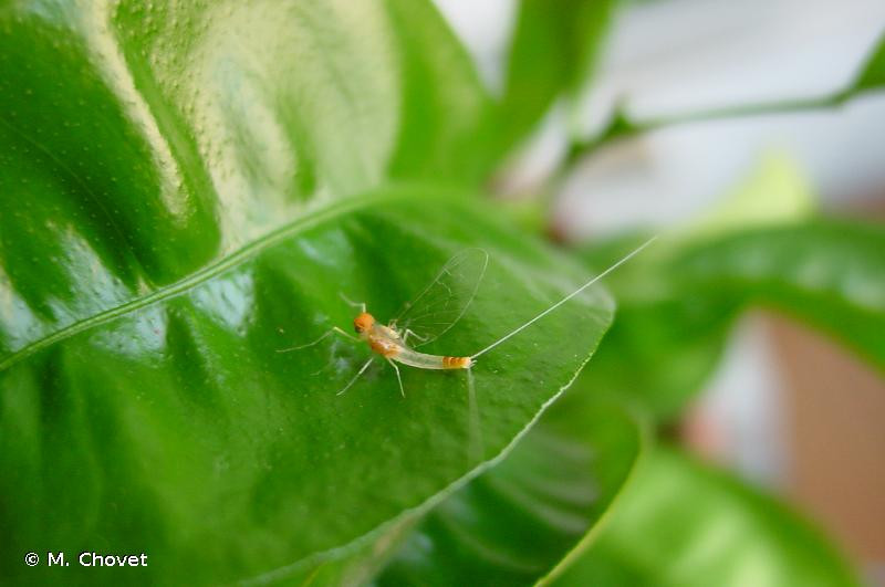 Imago mâle avec la tête et le thorax brun-clair, chamois, marqués de rouge. Yeux composés en turban, petite tige à la base brun-foncé, surmontée d’un anneau brun-clair, la face supérieure bombée, rouge-orangé cerclée d’un fin liseré jaune. Pattes blanchâtres. Ailes antérieures transparentes ; aire ptérigostigmatique blanchâtre à 7-11 intercalaires. Petites ailes postérieures très étroites, arrondies à leur extrémité, processus costal marqué. Abdomen aux tergites II-VI translucides, VII-IX rouge-vineux. Deux longs filaments caudaux blanchâtres.