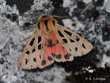 Le dessus des ailes antérieures est brun ocre avec trois rangées de taches noires triangulaires ou quadrangulaires plus ou moins étendues selon les individus. Le recto des ailes postérieures est rose chez les mâles et rose-rouge chez les femelles ; l'aire subterminale est pourvue de taches noires distinctes ; un trait épaissi noir souligne l'extrémité de la nervure cellulaire et parfois, l'aire basale possède une bande noire qui s'amincit en direction du bord anal. Le corps est traversé par une ligne noire qui se détache du fond ocre du thorax et du brun-rouge de l'abdomen.